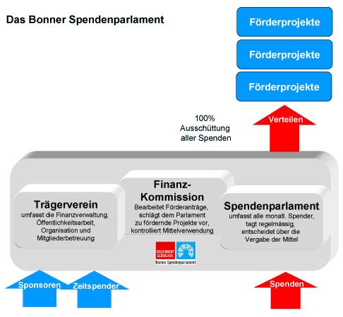 - dem Verein "Bonner Spendenparlament e.V.": Er trägt das Spendenparlament und leistet gemeinsam mit weiteren Aktiven die organisatorischen Aufgaben wie Spendeneinzug, Betreuung der Vereine und Parlamentarier, Ausschreibung, Prüfung und Begleitung der Förderungen, Organisation der Parlamentssitzung und Öffentlichkeitsarbeit. Er überwacht insbesondere die Ausschüttung der Fördergelder entsprechend des Parlamentsvotums und überprüft laufend die Verwendung der Spenden. Gemäß Vereinsrecht wird er durch den gewählten Vorstand vertreten. Der Verein hat zurzeit 25 Mitglieder, seine Satzung ist im Downloadbereich einsehbar.